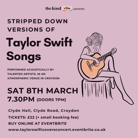 Taylor Swift songs, 7.30pm Saturday, 8 March at Clyde Hall, Clyde Road Mar 5, 2025 · by eastcroydon · in Sport & Leisure. · More information and tickets https://www.eventbrite.co.uk/e/stripped-back-an-acoustic-evening-of-taylor-swift-songs-unplugged-tickets-1120720598479?aff=ebdssbdestsearch Share this: Click to share on X (Opens in new window) X Click to share on Facebook (Opens in new window) Facebook Click to share on Bluesky (Opens in new window) Bluesky Click to share on Nextdoor (Opens in new window) Nextdoor Like Loading... Related