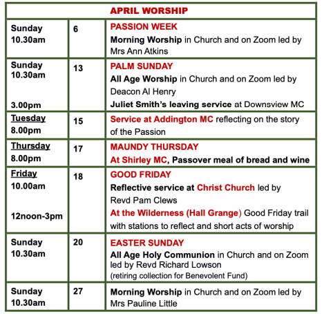 April diary for Christ Church, 114 Lower Addiscombe Road Apr 6, 2025 · by eastcroydon · in Faith & Charity, Uncategorized. · More information https://www.christchurchmeth.org.uk Share this: Click to share on X (Opens in new window) X Click to share on Facebook (Opens in new window) Facebook Click to share on Bluesky (Opens in new window) Bluesky Click to share on Nextdoor (Opens in new window) Nextdoor Like Loading... Related
