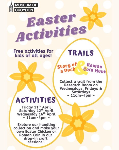 - Friday 11 & Saturday 12 April 11am – 12 pm Age under 5. Rhymetime. Book a free place https://libraries.croydon.gov.uk/events/location/48 .