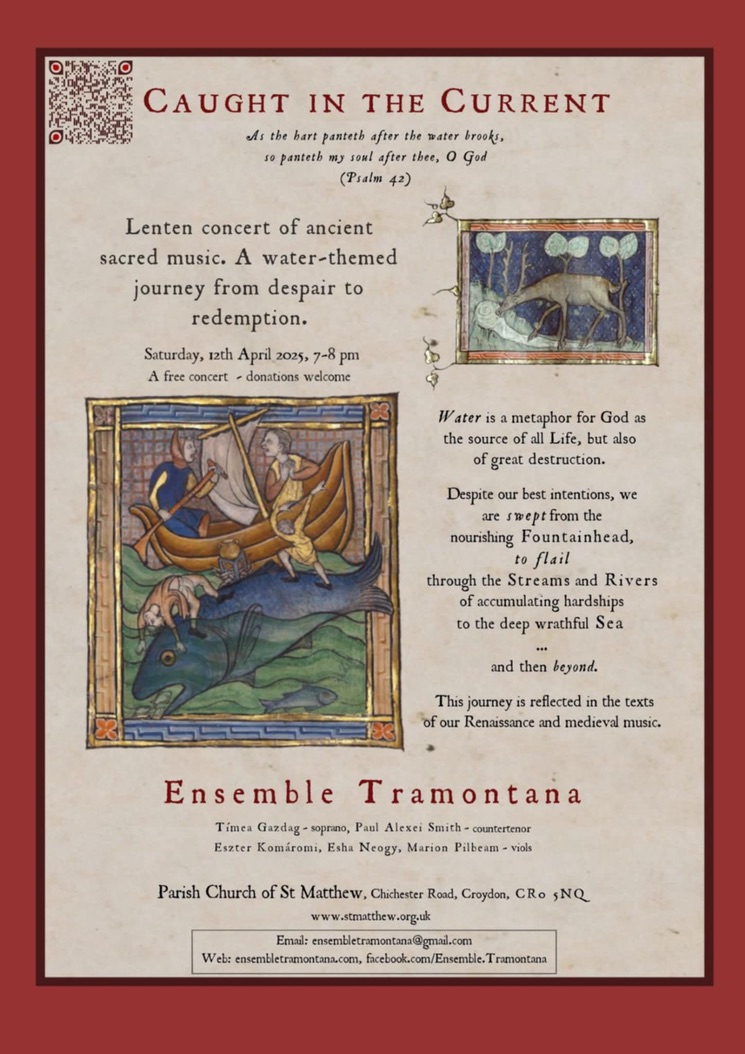 FREE concert of ancient sacred music 7pm Saturday, 12 April at St Matthew’s Church, Chichester Road @croydonbach @croydonphil @StMatthewCR Apr 10, 2025 · by eastcroydon · in Faith & Charity, Sport & Leisure. · More information about Ensemble Tramontana https://www.facebook.com/Ensemble.Tramontana Share this: Click to share on X (Opens in new window) X Click to share on Facebook (Opens in new window) Facebook Click to share on Bluesky (Opens in new window) Bluesky Click to share on Nextdoor (Opens in new window) Nextdoor Like Loading... Related