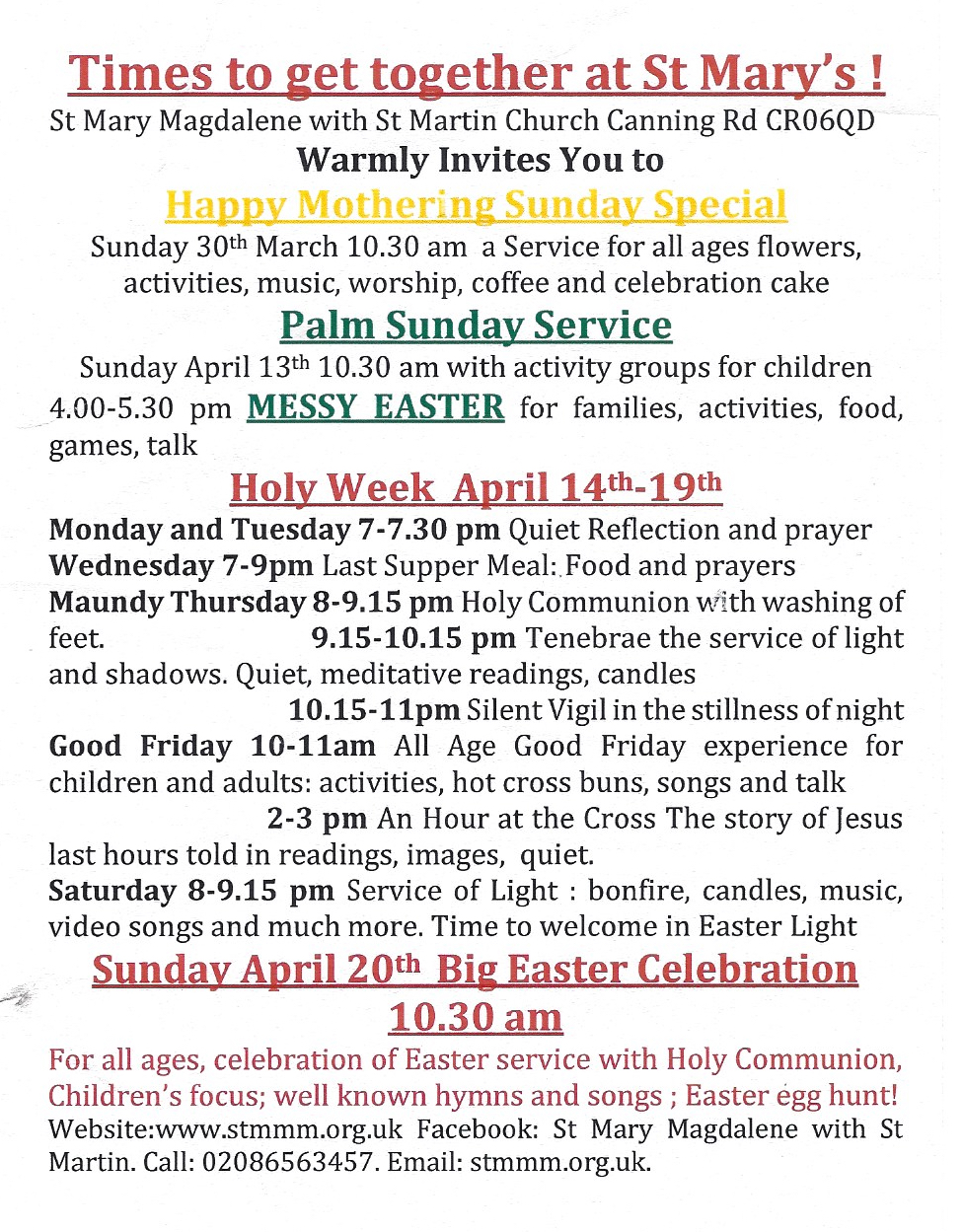 Easter events at St Mary Magdelene’s Church, Canning Road @STMMMCroydon Apr 11, 2025 · by eastcroydon · in Faith & Charity, Family & Education. · Share this: Click to share on X (Opens in new window) X Click to share on Facebook (Opens in new window) Facebook Click to share on Bluesky (Opens in new window) Bluesky Click to share on Nextdoor (Opens in new window) Nextdoor Like Loading... Related