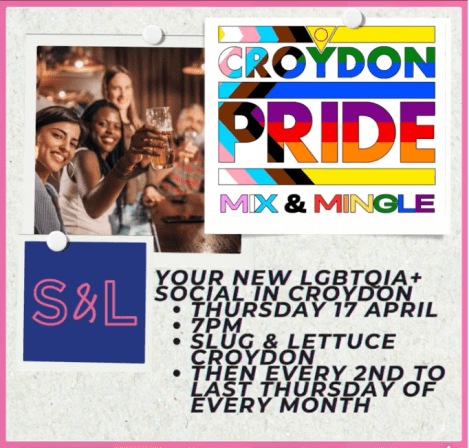 Croydon Pride Mix & Mingle 7pm, Thursday 17 April at The Slug & Lettuce, 10 Park Lane @QueerCroydon Apr 15, 2025 · by eastcroydon · in Sport & Leisure. · Share this: Click to share on X (Opens in new window) X Click to share on Facebook (Opens in new window) Facebook Click to share on Bluesky (Opens in new window) Bluesky Click to share on Nextdoor (Opens in new window) Nextdoor Like Loading... Related