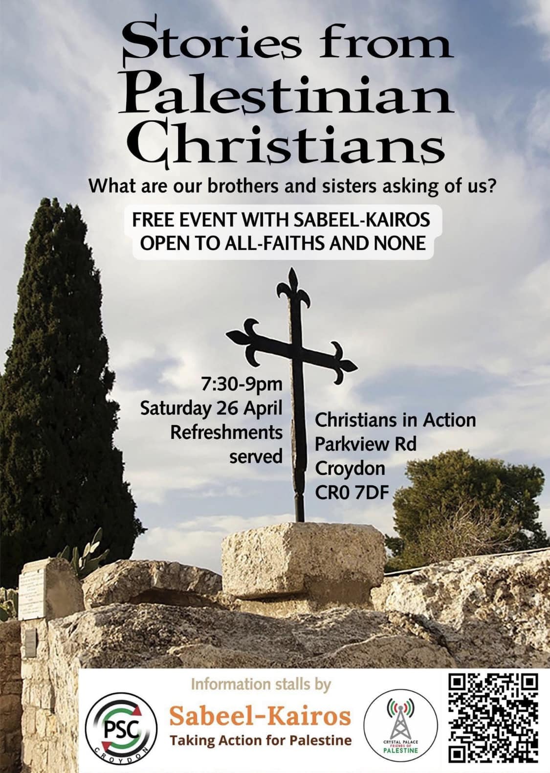 Stories from Palestinian Christians, 7.30pm Saturday, 26 April at Christians in Action, Bingham Road Apr 22, 2025 · by eastcroydon · in Faith & Charity, Get Involved. · More information about Christians in Action https://christiansinactionuk.com Share this: Click to share on X (Opens in new window) X Click to share on Facebook (Opens in new window) Facebook Click to share on Bluesky (Opens in new window) Bluesky Click to share on Nextdoor (Opens in new window) Nextdoor Like Loading... Related