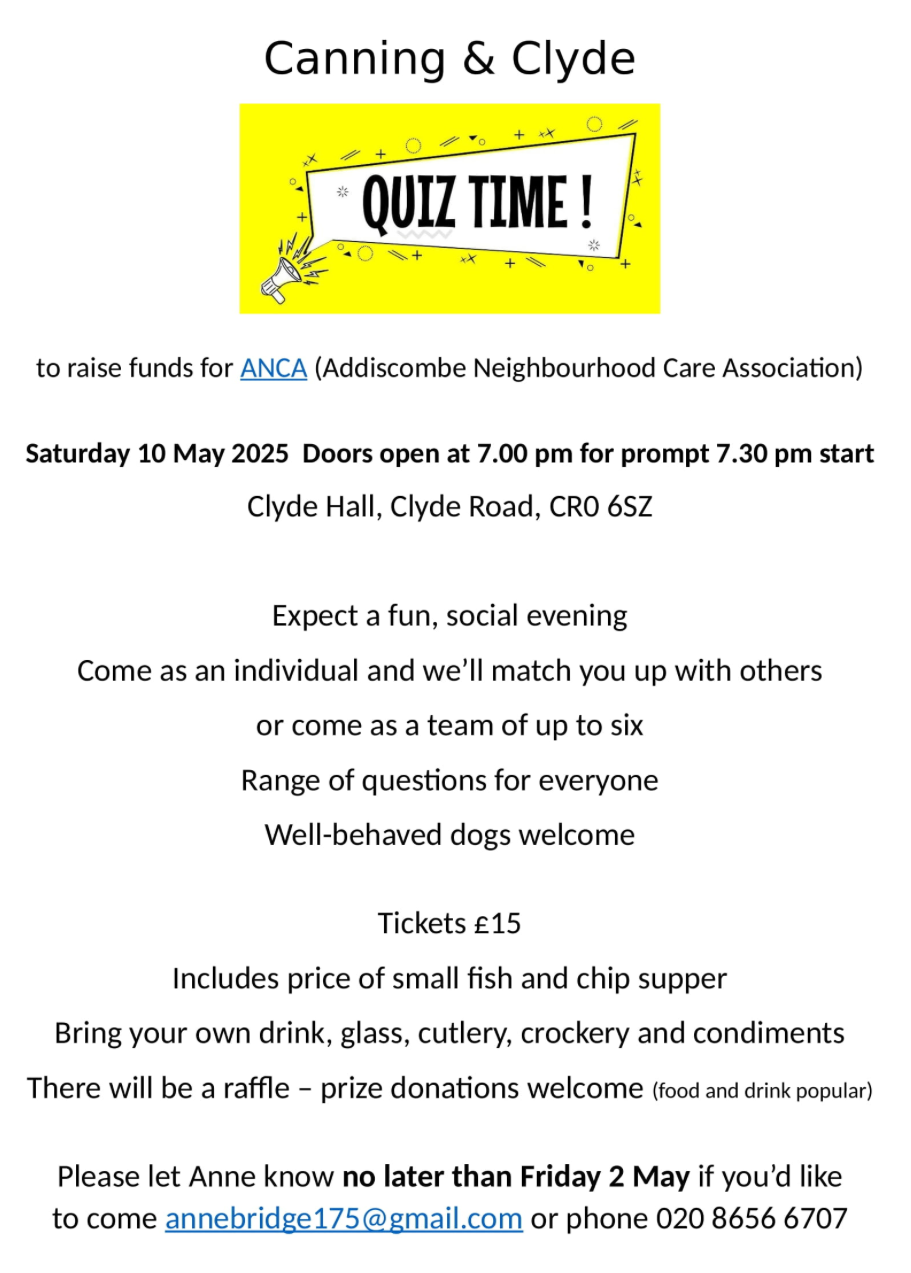 Book your place before midnight Friday, 2 May for the Canning & Clyde charity quiz #croydon May 1, 2025 · by eastcroydon · in Faith & Charity, Sport & Leisure. · Share this: Click to share on X (Opens in new window) X Click to share on Facebook (Opens in new window) Facebook Click to share on Bluesky (Opens in new window) Bluesky Click to share on Nextdoor (Opens in new window) Nextdoor Like Loading... Related
