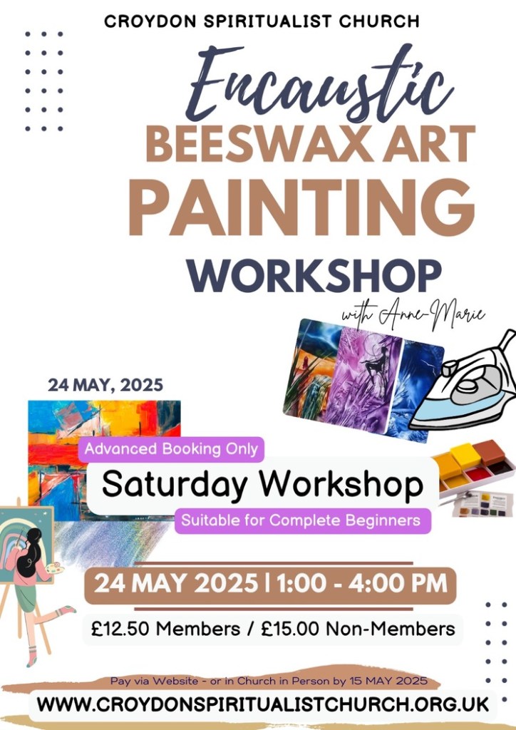 Beeswax art painting workshop 1pm Saturday, 24 May at Croydon Spiritualist Church, Chatsworth Road #croydon May 23, 2025 · by eastcroydon · in Sport & Leisure. · More information about events at Croydon Spiritualist Church https://croydonspiritualistchurch.org.uk Share this: Click to share on X (Opens in new window) X Click to share on Facebook (Opens in new window) Facebook Click to share on Bluesky (Opens in new window) Bluesky Click to share on Nextdoor (Opens in new window) Nextdoor Like Loading... Related
