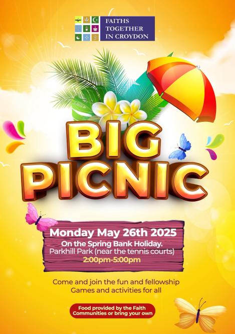 Faiths Together in Croydon picnic 2-5pm Monday 26 May near Park Hill Park tennis courts #croydon May 25, 2025 · by eastcroydon · in Faith & Charity, Sport & Leisure. · More information about Faiths Together in Croydon https://faithstogetherincroydon.org.uk Share this: Click to share on X (Opens in new window) X Click to share on Facebook (Opens in new window) Facebook Click to share on Bluesky (Opens in new window) Bluesky Click to share on Nextdoor (Opens in new window) Nextdoor Like Loading... Related