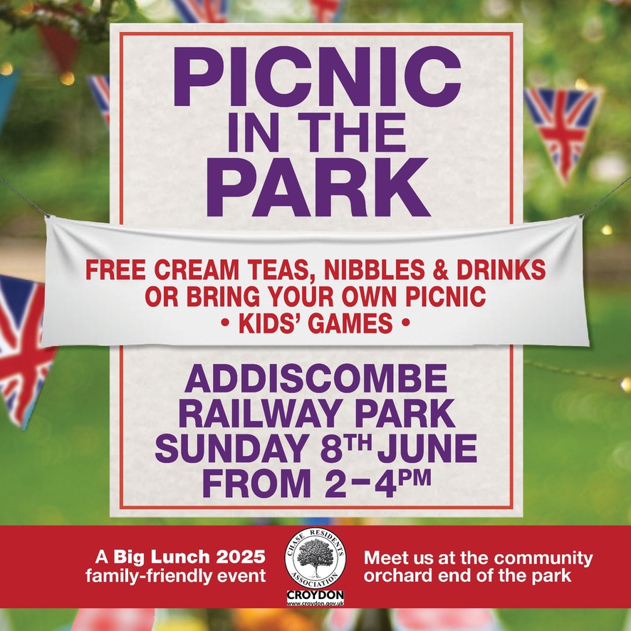 Picnic 2-4pm, Sunday, 8 June in Addiscombe Railway Park #croydon Jun 5, 2025 · by eastcroydon · in Sport & Leisure. · More information https://www.facebook.com/CHASEresidentsassociation Share this: Click to share on X (Opens in new window) X Click to share on Facebook (Opens in new window) Facebook Click to share on Bluesky (Opens in new window) Bluesky Click to share on Nextdoor (Opens in new window) Nextdoor Like Loading... Related