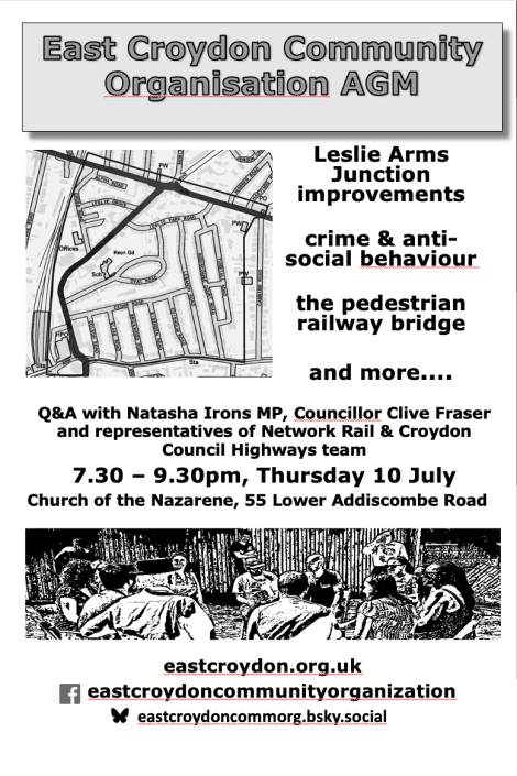 East Croydon Community Organisation AGM 7.30pm Thursday, 10 July at the Church of the Nazarene, 55 Lower Addiscombe Road #croydon Jun 11, 2025 · by eastcroydon · in Public Meetings. · Minutes of previous ECCO AGMs https://eastcroydon.org.uk/first-public-meeting/ Share this: Share on X (Opens in new window) X Share on Facebook (Opens in new window) Facebook Share on Bluesky (Opens in new window) Bluesky Share on Nextdoor (Opens in new window) Nextdoor Like Loading... Related