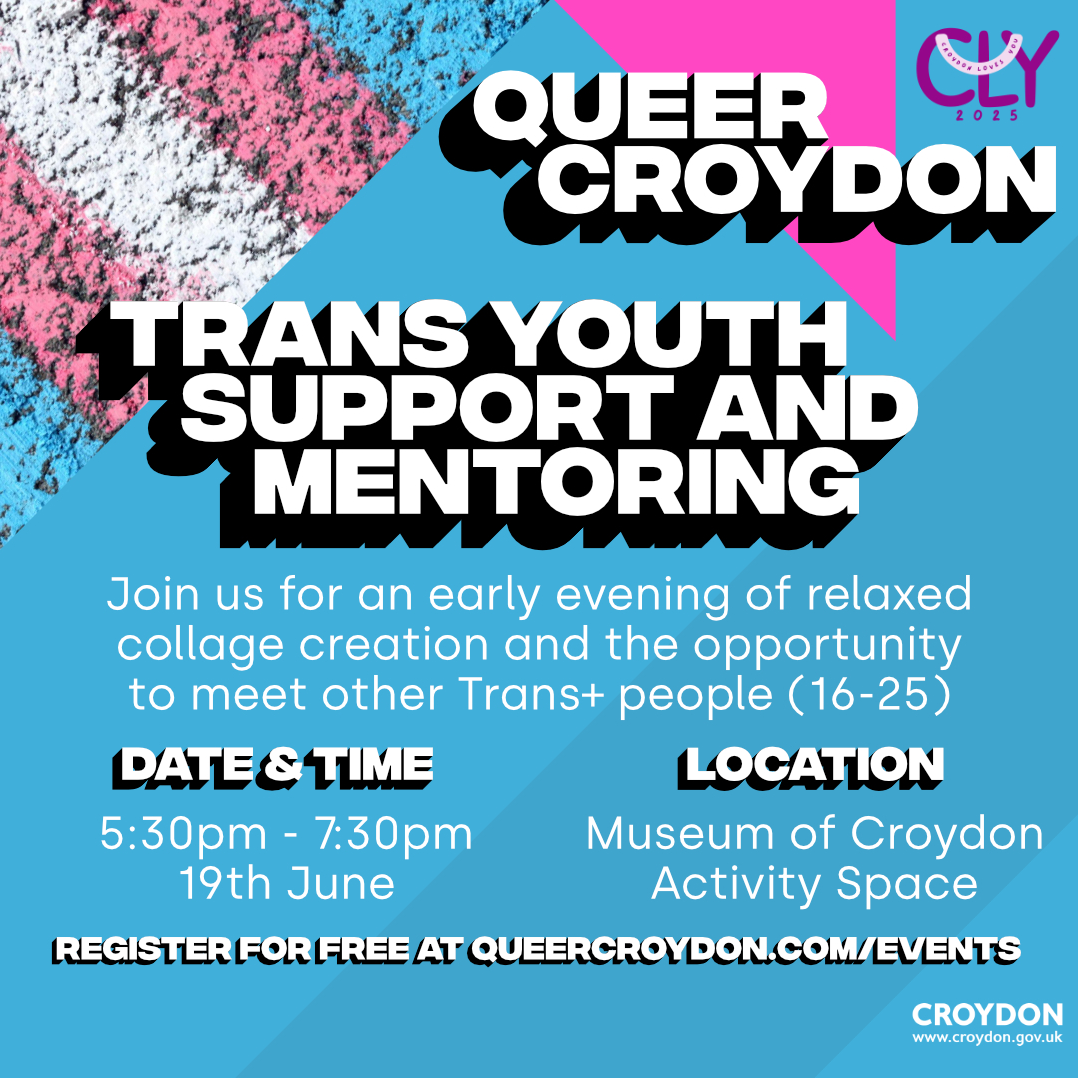 Trans youth support & mentoring 5.30pm Wednesday, 19 June at Croydon Clocktower, Katharine Street #croydon Jun 18, 2025 · by eastcroydon · in Family & Education, Sport & Leisure. · More information https://queercroydon.com/events/trans-youth-support-mentoring-01/ Share this: Click to share on X (Opens in new window) X Click to share on Facebook (Opens in new window) Facebook Click to share on Bluesky (Opens in new window) Bluesky Click to share on Nextdoor (Opens in new window) Nextdoor Like Loading... Related