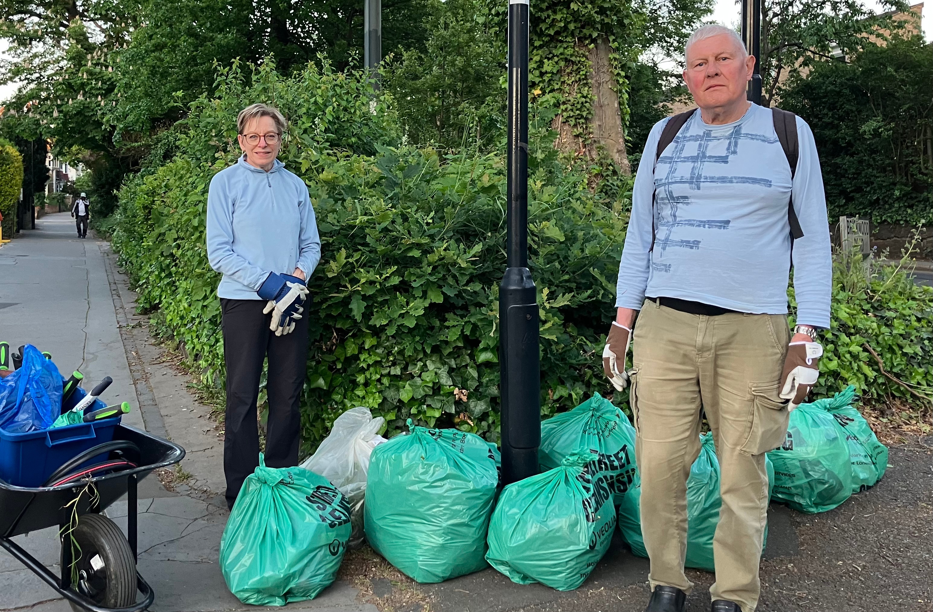There will also be work on the Joan Pick legacy bed. Andrea Perry recently renewed the borders and planted some colourful flowers and shrubs. I have been watering them through the hot spell and despite the heat the plants continue to flourish, alongside proliferating weeds, unfortunately. Annie (Tunstall Road) and Steve (Cross Road) helped Andrea, Ann (Cedar Road) & Angela (Lebanon Road) to removed 10 bags full of surplus vegetation and rubbish at the last tidy-up on 13 May. Annie and Steve are pictured above.