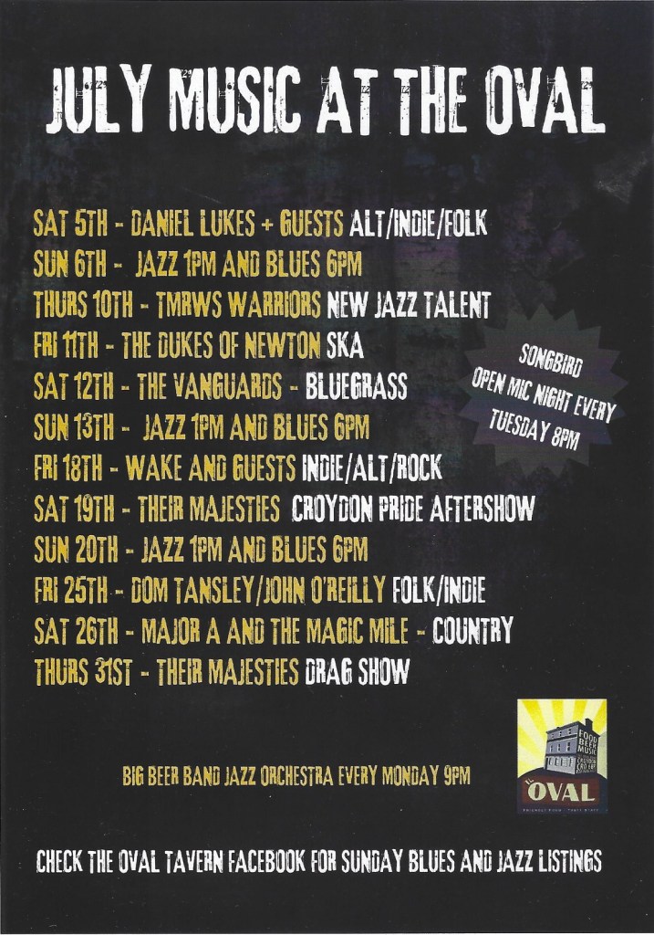 Music in July & August 25 at The Oval Tavern #croydon Jul 5, 2025 · by eastcroydon · in Sport & Leisure, Uncategorized. · Share this: Click to share on X (Opens in new window) X Click to share on Facebook (Opens in new window) Facebook Click to share on Bluesky (Opens in new window) Bluesky Click to share on Nextdoor (Opens in new window) Nextdoor Like Loading... Related