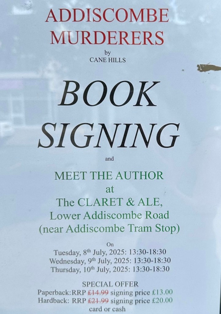 “Addiscombe Murderers” book signing 1.30 – 6.30pm Tuesday, 8 to Thursday, 10 July at The Claret & Ale, 5 Bingham Corner, Lower Addiscombe Road #croydon Jul 6, 2025 · by eastcroydon · in Shopping & Take-aways, Sport & Leisure, Uncategorized. · More information about the award-winning Claret & Ale https://camra.org.uk/pubs/claret-ale-addiscombe-141487 Share this: Click to share on X (Opens in new window) X Click to share on Facebook (Opens in new window) Facebook Click to share on Bluesky (Opens in new window) Bluesky Click to share on Nextdoor (Opens in new window) Nextdoor Like Loading... Related
