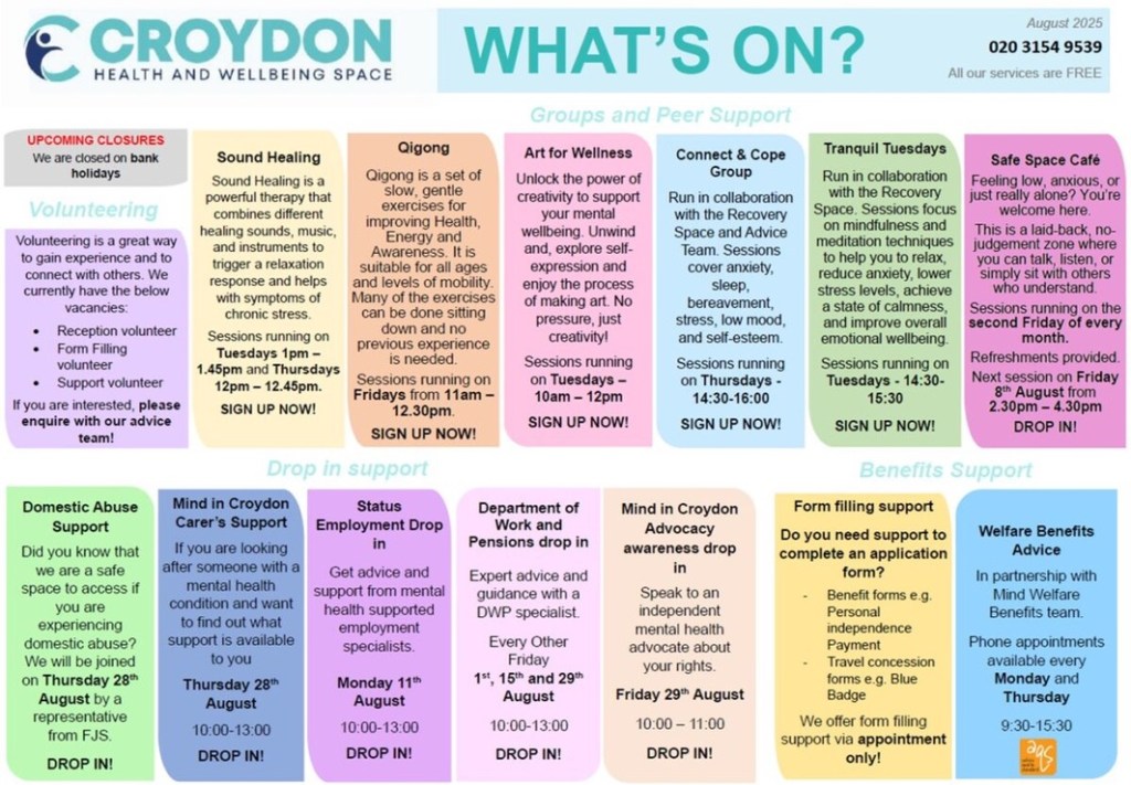 What’s on in August at Croydon Health & Wellbeing Space, 1st floor, Whitgift Shopping Centre #croydon Jul 28, 2025 · by eastcroydon · in Health & Beauty. · More information https://croydonhws.co.uk/about/ Share this: Click to share on X (Opens in new window) X Click to share on Facebook (Opens in new window) Facebook Click to share on Bluesky (Opens in new window) Bluesky Click to share on Nextdoor (Opens in new window) Nextdoor Like Loading... Related