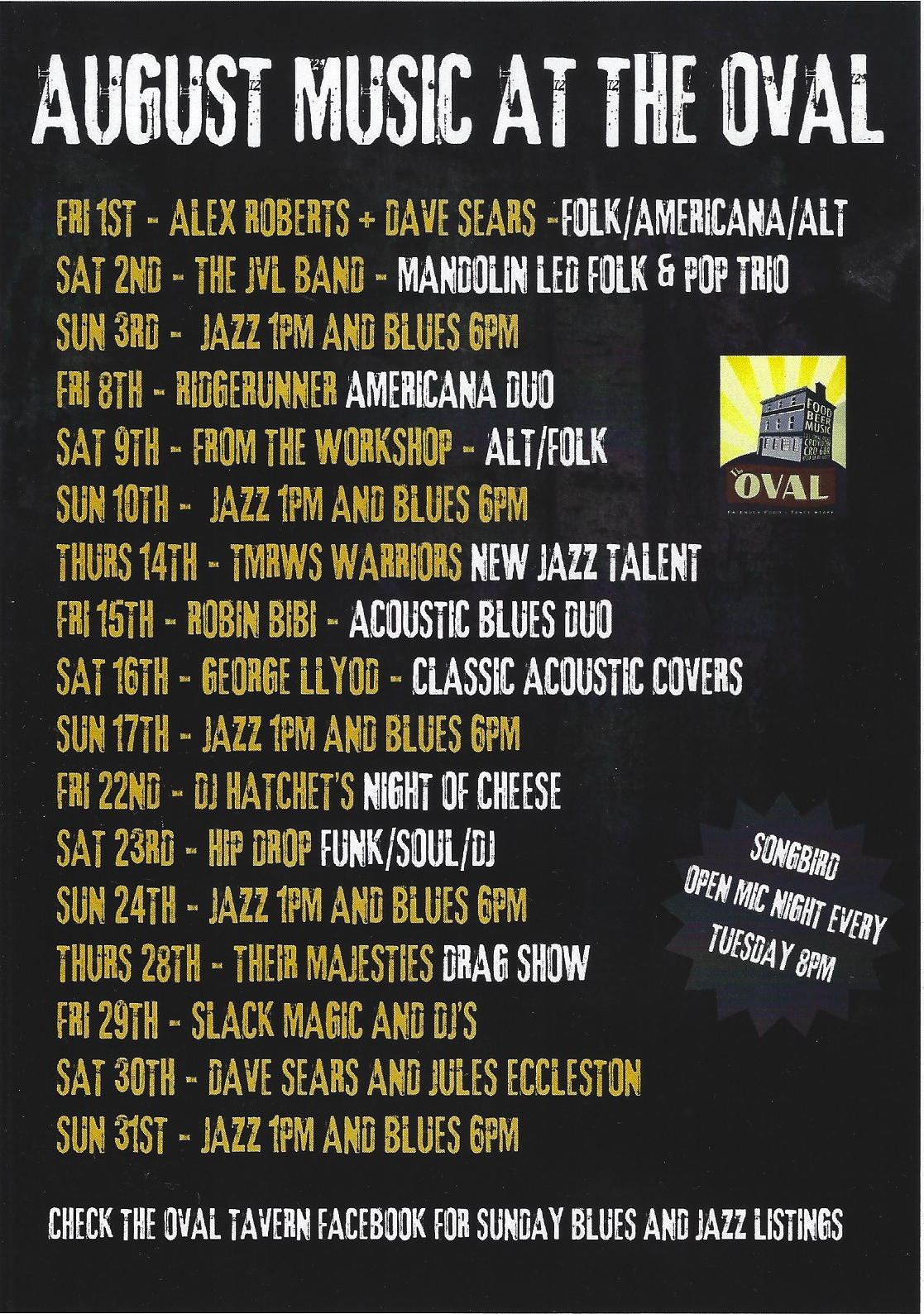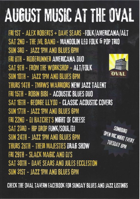 Music in August 25 at The Oval Tavern #croydon Jul 29, 2025 · by eastcroydon · in Sport & Leisure, Uncategorized. · More information https://www.facebook.com/theovalcroydon Share this: Click to share on X (Opens in new window) X Click to share on Facebook (Opens in new window) Facebook Click to share on Bluesky (Opens in new window) Bluesky Click to share on Nextdoor (Opens in new window) Nextdoor Like Loading... Related
