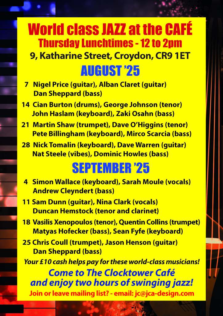 Jazz 12pm Thursdays in August and September 25 at Croydon Clocktower Cafe #croydon Aug 6, 2025 · by eastcroydon · in Sport & Leisure. · Share this: Click to share on X (Opens in new window) X Click to share on Facebook (Opens in new window) Facebook Click to share on Bluesky (Opens in new window) Bluesky Click to share on Nextdoor (Opens in new window) Nextdoor Like Loading... Related