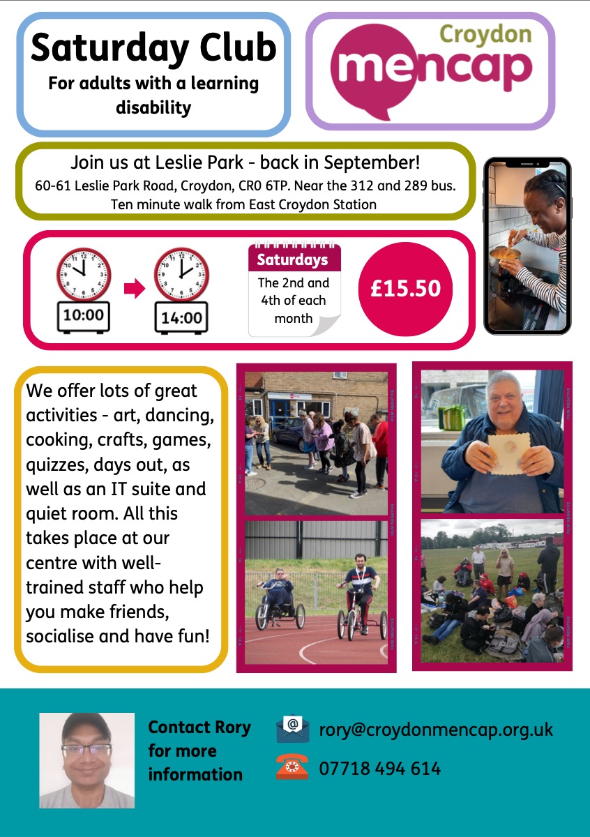 Saturday Club for adults with a learning disability 10am to 2pm from 13 September, 60-61 Leslie Park Road #croydon Sep 8, 2025 · by eastcroydon · in Family & Education, Sport & Leisure. · The Club is held on the 2nd and 4th Saturday each month. More information https://www.croydonmencap.org.uk Share this: Click to share on X (Opens in new window) X Click to share on Facebook (Opens in new window) Facebook Click to share on Bluesky (Opens in new window) Bluesky Click to share on Nextdoor (Opens in new window) Nextdoor Like Loading... Related