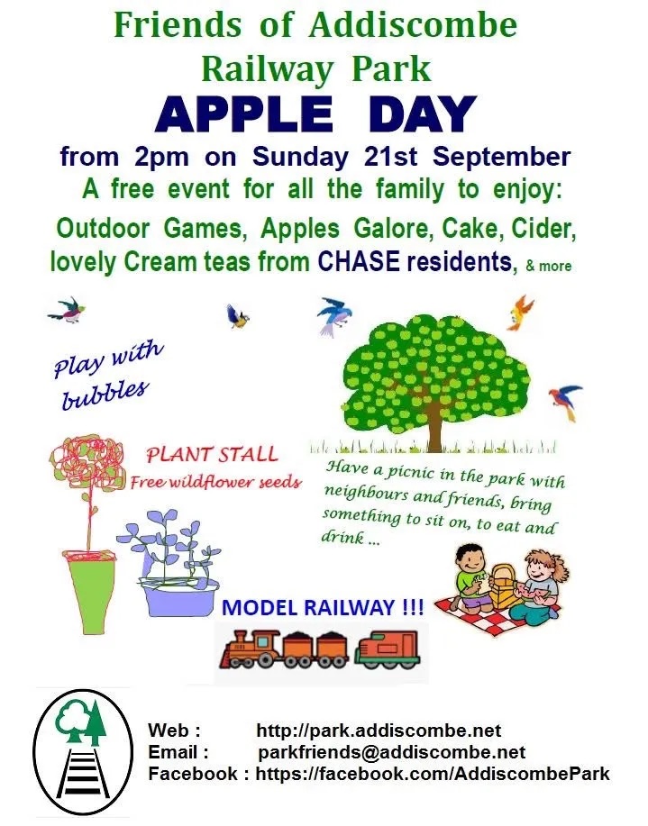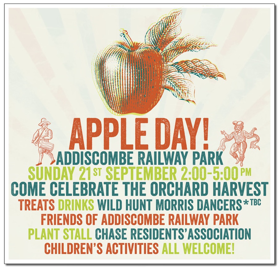 Apple Day 2-5pm Sunday, 21 September in Addiscombe Railway Park #croydon Sep 18, 2025 · by eastcroydon · in Environment & Recycling, Sport & Leisure. · More information http://park.addiscombe.net Share this: Click to share on X (Opens in new window) X Click to share on Facebook (Opens in new window) Facebook Click to share on Bluesky (Opens in new window) Bluesky Click to share on Nextdoor (Opens in new window) Nextdoor Like Loading... Related