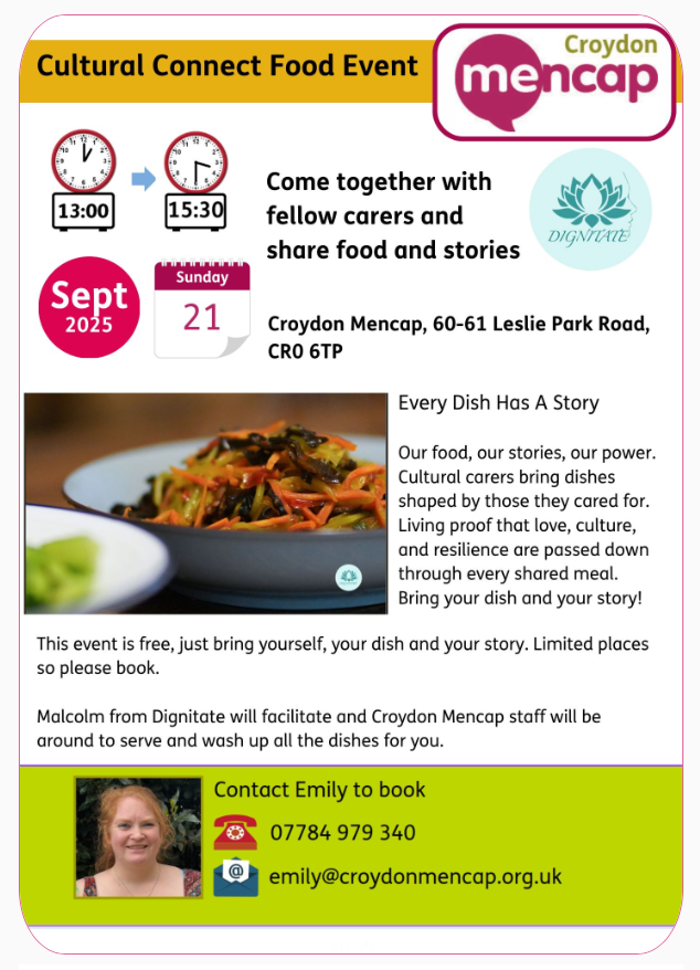 Cultural connect food event 1pm Sunday, 21 September at Croydon Mencap, 60-61 Leslie Park Road #croydon Sep 19, 2025 · by eastcroydon · in Family & Education, Get Involved. · Share this: Click to share on X (Opens in new window) X Click to share on Facebook (Opens in new window) Facebook Click to share on Bluesky (Opens in new window) Bluesky Click to share on Nextdoor (Opens in new window) Nextdoor Like Loading... Related
