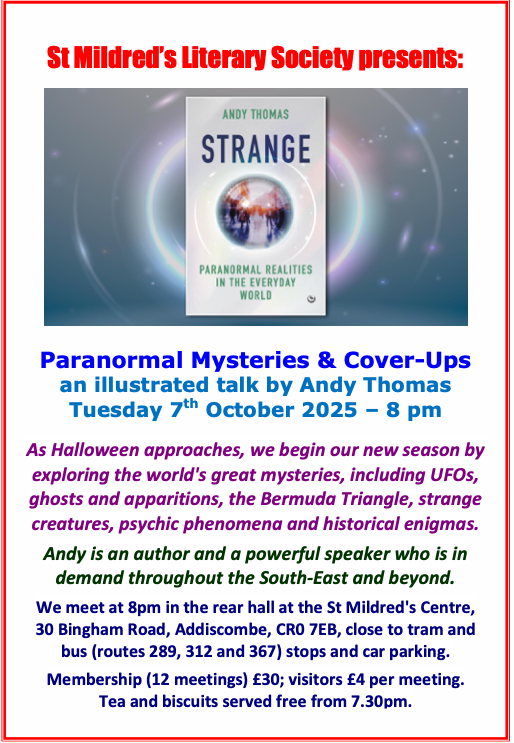 “Paranormal mysteries & cover-ups” talk 8pm Tuesday, 7 October in St Mildred’s pavilion, 30 Bingham Road #croydon Oct 2, 2025 · by eastcroydon · in Sport & Leisure. · Share this: Click to share on X (Opens in new window) X Click to share on Facebook (Opens in new window) Facebook Click to share on Bluesky (Opens in new window) Bluesky Click to share on Nextdoor (Opens in new window) Nextdoor Like Loading... Related