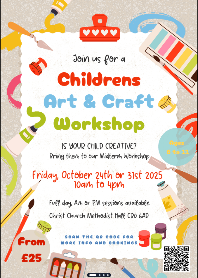 Children’s art & craft workshops 10am – 4pm Fridays, 24 & 31 October at Christ Church, 114 Lower Addiscombe Road #croydon Oct 21, 2025 · by eastcroydon · in Family & Education, Sport & Leisure. · More information about Seasons https://www.instagram.com/seasonsartclasseastcroydon/ Share this: Click to share on X (Opens in new window) X Click to share on Facebook (Opens in new window) Facebook Click to share on Bluesky (Opens in new window) Bluesky Click to share on Nextdoor (Opens in new window) Nextdoor Like Loading... Related