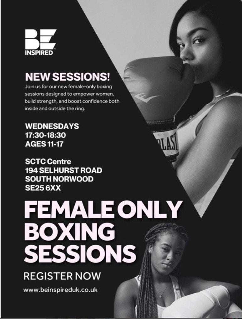 Female only boxing sessions 5.30pm Wednesdays at the Samuel Coleridge Taylor Centre, 194 Selhurst Road #croydon Oct 26, 2025 · by eastcroydon · in Sport & Leisure. · Screenshot More information about Be Inspired https://www.beinspireduk.co.uk Share this: Click to share on X (Opens in new window) X Click to share on Facebook (Opens in new window) Facebook Click to share on Bluesky (Opens in new window) Bluesky Click to share on Nextdoor (Opens in new window) Nextdoor Like Loading... Related