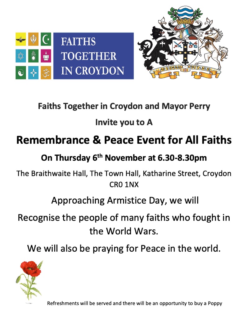 Remembrance & Peace event for All Faiths 6.30pm Thursday, 6 November at Croydon Town Hall, Katharine Street #croydon Nov 4, 2025 · by eastcroydon · in Faith & Charity. · More information about Faiths Together in Croydon https://www.facebook.com/groups/FaitsTogetherInCroydon Share this: Click to share on X (Opens in new window) X Click to share on Facebook (Opens in new window) Facebook Click to share on Bluesky (Opens in new window) Bluesky Click to share on Nextdoor (Opens in new window) Nextdoor Like Loading... Related