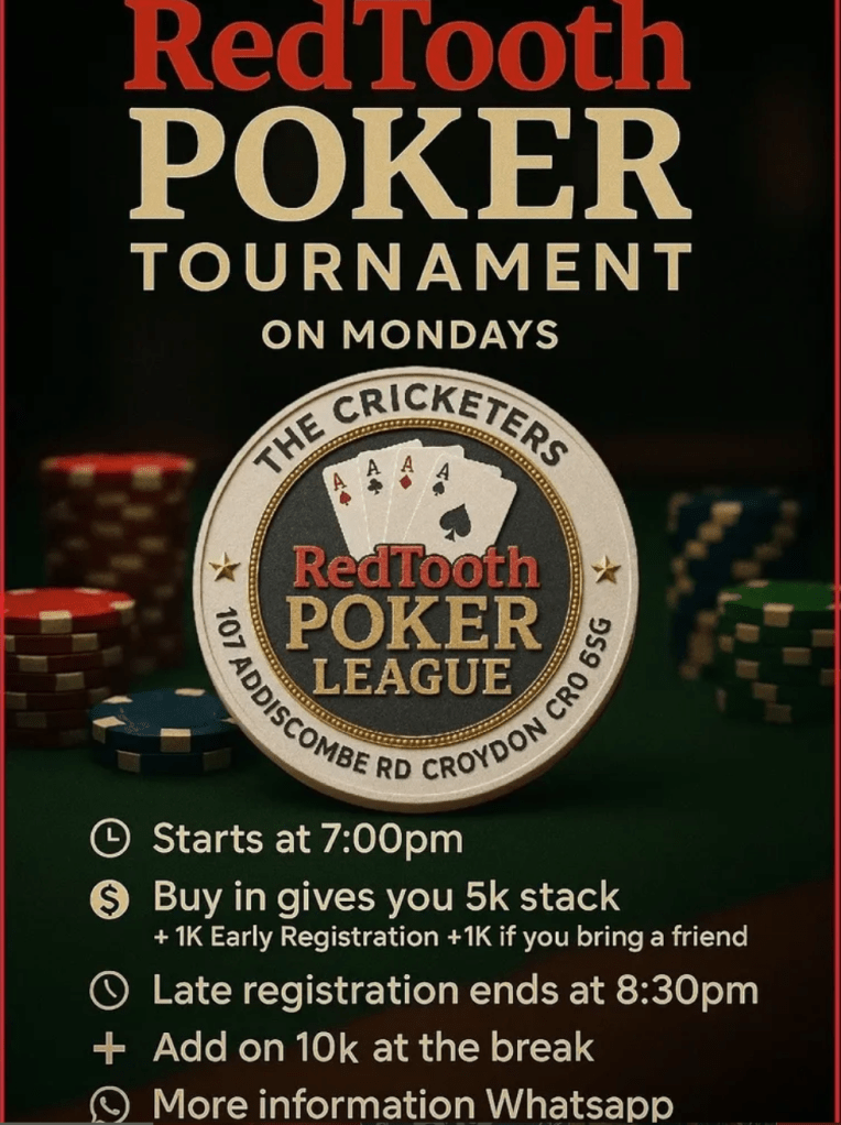 Play poker from 7pm Mondays at The Cricketers, 107 Addiscombe Road #croydon Nov 9, 2025 · by eastcroydon · in Sport & Leisure. · Follow The Cricketers on Instagram https://www.instagram.com/thecricketers.croydon/?hl=en Share this: Click to share on X (Opens in new window) X Click to share on Facebook (Opens in new window) Facebook Click to share on Bluesky (Opens in new window) Bluesky Click to share on Nextdoor (Opens in new window) Nextdoor Like Loading... Related