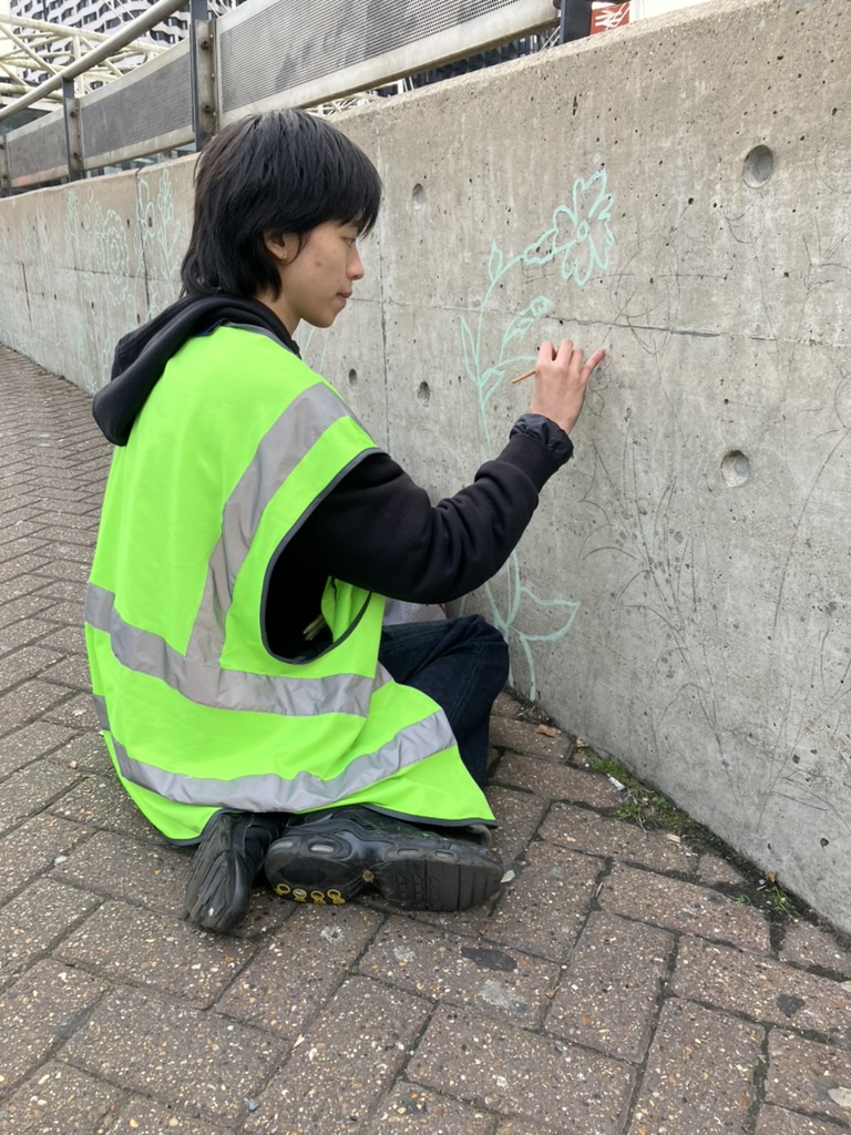 Last weekend, Yvonne Tran painted the first outlines of the some of the flowers to be included in a mural on the low concrete wall along Billinton Hill leading up to East Croydon Station. Weather permitting, work will continue on the outlines this weekend.