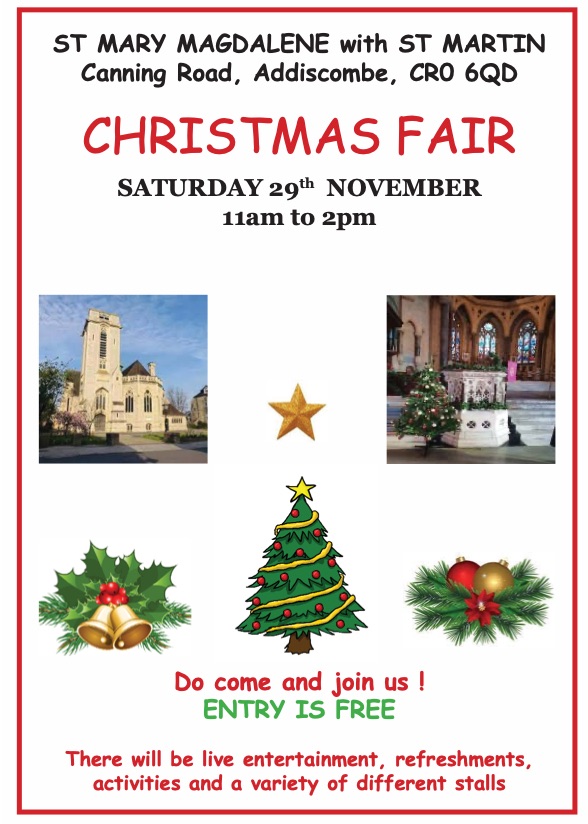 Christmas fair 11am-2pm Saturday 29, November at St Mary Magdalene Church, Canning Road #croydon Nov 28, 2025 · by eastcroydon · in Shopping & Take-aways. · More information about St Mary Magdalene Church https://www.facebook.com/profile.php?id=100070663444281 Share this: Click to share on X (Opens in new window) X Click to share on Facebook (Opens in new window) Facebook Click to share on Bluesky (Opens in new window) Bluesky Click to share on Nextdoor (Opens in new window) Nextdoor Like Loading... Related