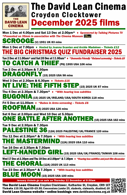 Films in December 2025 at the David Lean Cinema, Katharine Street #croydon Dec 1, 2025 · by eastcroydon · in Sport & Leisure. · More information https://www.davidleancinema.org.uk/listings/ Share this: Click to share on X (Opens in new window) X Click to share on Facebook (Opens in new window) Facebook Click to share on Bluesky (Opens in new window) Bluesky Click to share on Nextdoor (Opens in new window) Nextdoor Like Loading... Related