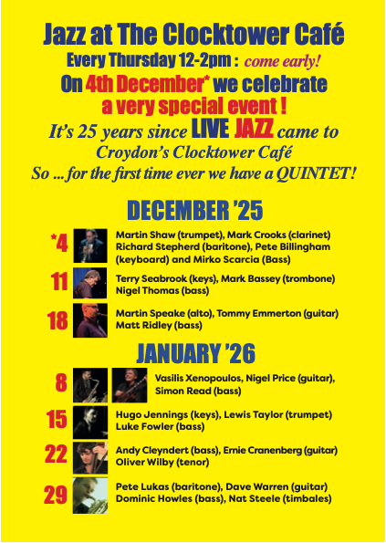 Jazz 12pm Thursdays in December & January at the Clocktower Cafe, Katharine Street #croydon Dec 3, 2025 · by eastcroydon · in Uncategorized. · Share this: Click to share on X (Opens in new window) X Click to share on Facebook (Opens in new window) Facebook Click to share on Bluesky (Opens in new window) Bluesky Click to share on Nextdoor (Opens in new window) Nextdoor Like Loading... Related