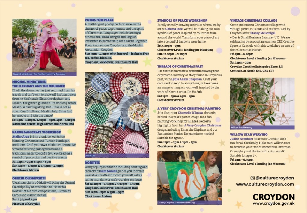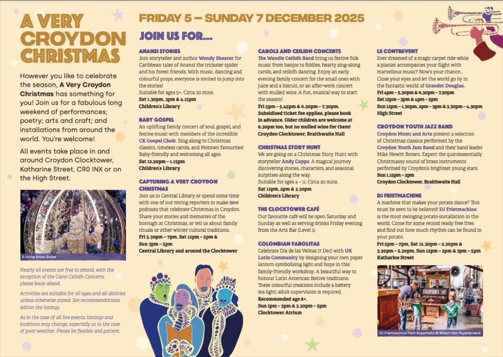 Full programme for A Very Croydon Christmas events Friday 5 to Sunday 7, December in Croydon Clocktower, Katharine Street, High Street, North End and Centrale #croydon Dec 4, 2025 · by eastcroydon · in Family & Education, Sport & Leisure. · More information https://www.culturecroydon.com/event/a-very-croydon-christmas-3/?es_c=62DBE54D2B2BEC2113670E1B3D99EA69&es_cl=9CBBB0BBEA2ED95C4594858070CF787D&es_id=p7h£42 Share this: Click to share on X (Opens in new window) X Click to share on Facebook (Opens in new window) Facebook Click to share on Bluesky (Opens in new window) Bluesky Click to share on Nextdoor (Opens in new window) Nextdoor Like Loading... Related