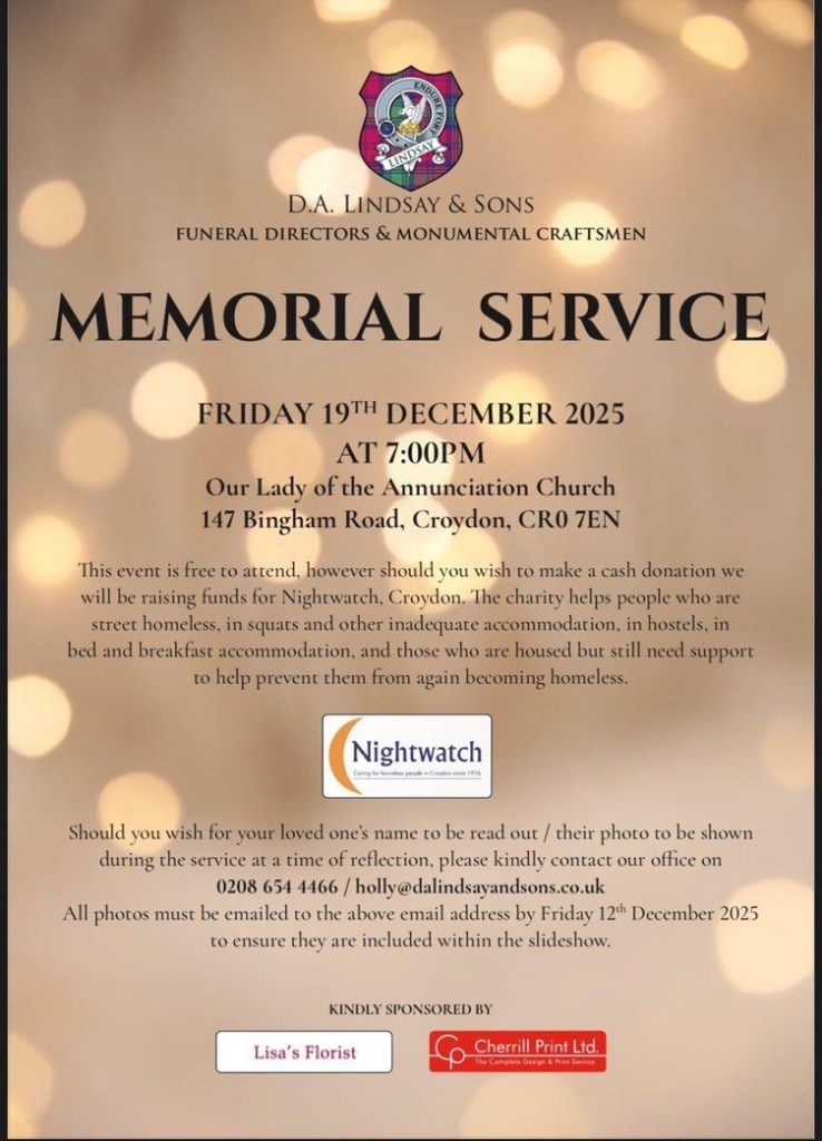 Memorial service 7pm Friday, 19 December at Our Lady of the Renunciation, 117 Bingham Road #croydon Dec 17, 2025 · by eastcroydon · in Faith & Charity, Family & Education. · More information about D A Lindsay & Sons, 111 Lower Addiscombe Road https://dalindsayandsons.co.uk Share this: Click to share on X (Opens in new window) X Click to share on Facebook (Opens in new window) Facebook Click to share on Bluesky (Opens in new window) Bluesky Click to share on Nextdoor (Opens in new window) Nextdoor Like Loading... Related