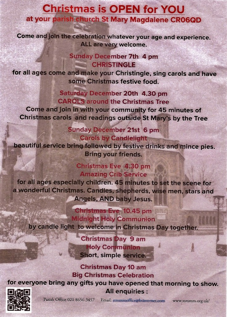 Carols round the Christmas tree 4.30pm Saturday, 20 December & other services at St Mary Magdalene, Canning Road #croydon Dec 18, 2025 · by eastcroydon · in Faith & Charity. · More information https://www.stmmm.org.uk Share this: Click to share on X (Opens in new window) X Click to share on Facebook (Opens in new window) Facebook Click to share on Bluesky (Opens in new window) Bluesky Click to share on Nextdoor (Opens in new window) Nextdoor Like Loading... Related