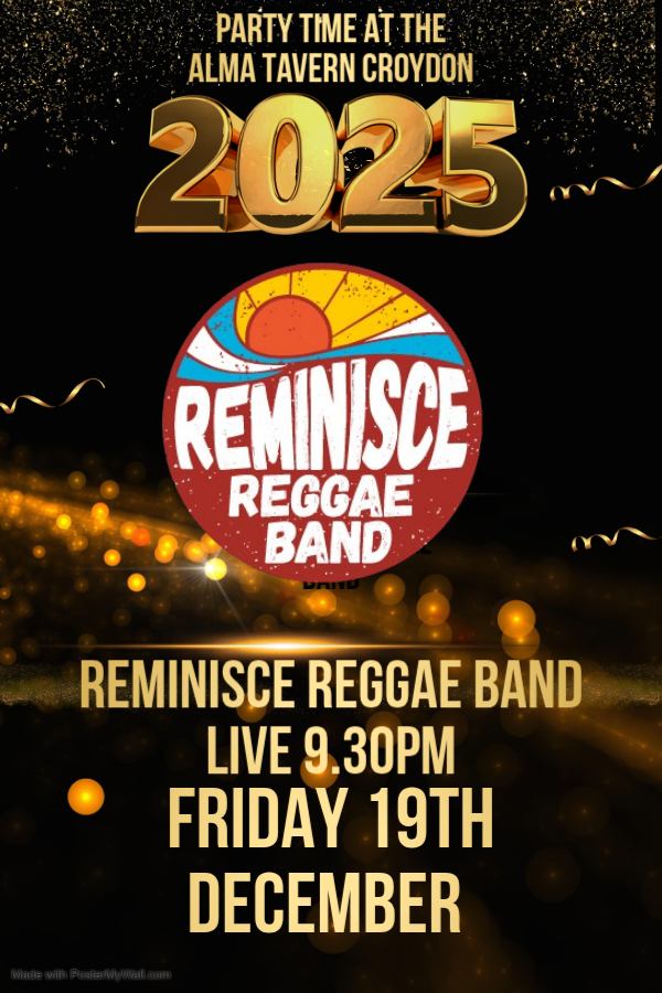 Reminisce Reggae Band 9.30pm Friday, 19 December at The Alma Tavern, 127 Lower Addiscombe Road #croydon Dec 18, 2025 · by eastcroydon · in Sport & Leisure. · More information https://www.instagram.com/thealmataverncr0/ Share this: Click to share on X (Opens in new window) X Click to share on Facebook (Opens in new window) Facebook Click to share on Bluesky (Opens in new window) Bluesky Click to share on Nextdoor (Opens in new window) Nextdoor Like Loading... Related
