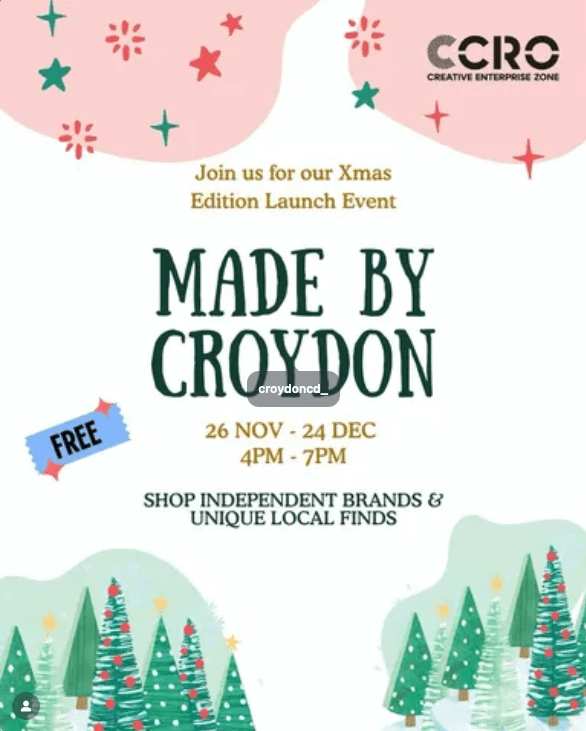Last day of Made by Croydon market 4-7pm Wednesday, 24 December at Croydon Creative Enterprise Zone, lower ground floor Centrale shopping centre #croydon Dec 22, 2025 · by eastcroydon · in Shopping & Take-aways. · More information https://www.instagram.com/croydoncd_?es_c=62DBE54D2B2BEC2113670E1B3D99EA69&es_cl=8C27E69B137A964061E03271A59B5607&es_id=p7h£42 Share this: Click to share on X (Opens in new window) X Click to share on Facebook (Opens in new window) Facebook Click to share on Bluesky (Opens in new window) Bluesky Click to share on Nextdoor (Opens in new window) Nextdoor Like Loading... Related