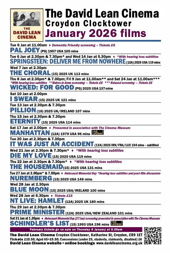 Films in January 2026 at the David Lean Cinema, Katharine Street #croydon Jan 3, 2026 · by eastcroydon · in Sport & Leisure, Uncategorized. · More information https://www.davidleancinema.org.uk/listings/ Share this: Click to share on X (Opens in new window) X Click to share on Facebook (Opens in new window) Facebook Click to share on Bluesky (Opens in new window) Bluesky Click to share on Nextdoor (Opens in new window) Nextdoor Like Loading... Related