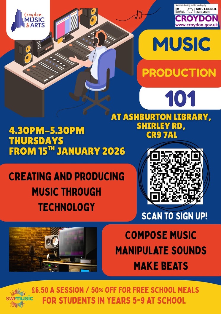Music production for years 5-9 4.30pm Thursdays from 15 January at Ashburton Library, Shirley Road #croydon Jan 7, 2026 · by eastcroydon · in Family & Education. · More information https://www.croydonmusicandarts.co.uk/learn-with-us/cma-centres-and-activities/ Share this: Click to share on X (Opens in new window) X Click to share on Facebook (Opens in new window) Facebook Click to share on Bluesky (Opens in new window) Bluesky Click to share on Nextdoor (Opens in new window) Nextdoor Like Loading... Related