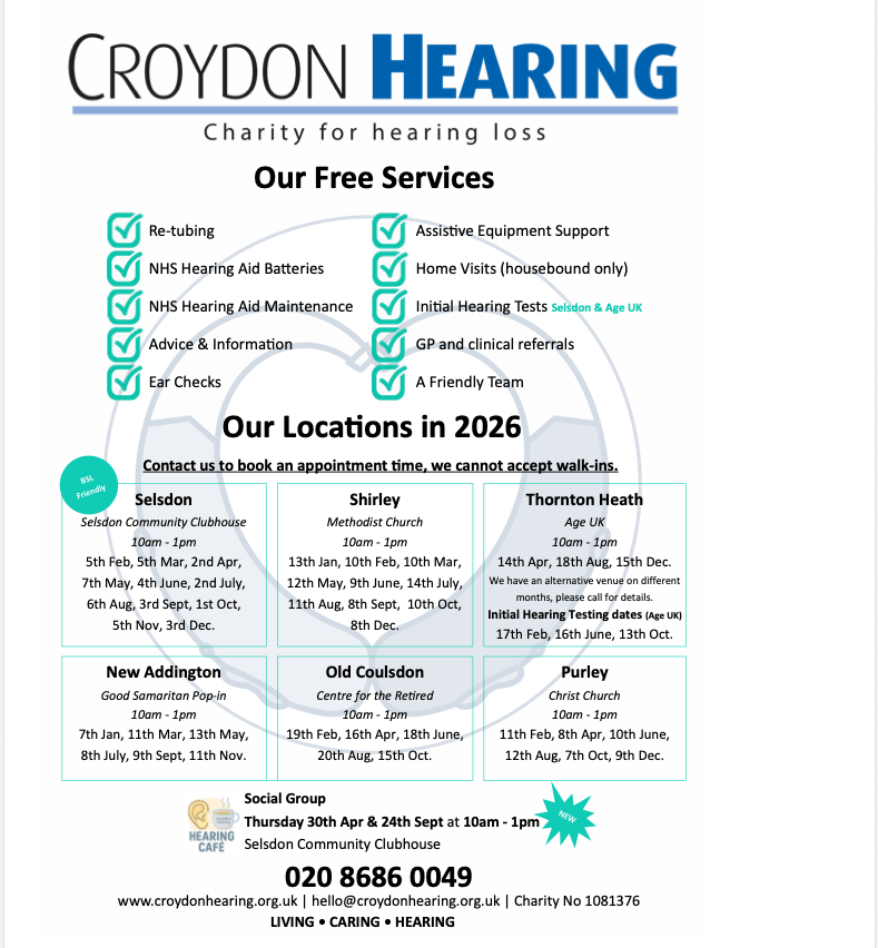 Croydon Hearing community surgery 10am-1pm Tuesday 13 January at Shirley Methodist Church, Eldon Avenue,#croydon Jan 12, 2026 · by eastcroydon · in Health & Beauty, Uncategorized. · Croydon Hearing is a local charity. More information https://www.croydonhearing.org.uk Share this: Click to share on X (Opens in new window) X Click to share on Facebook (Opens in new window) Facebook Click to share on Bluesky (Opens in new window) Bluesky Click to share on Nextdoor (Opens in new window) Nextdoor Like Loading... Related