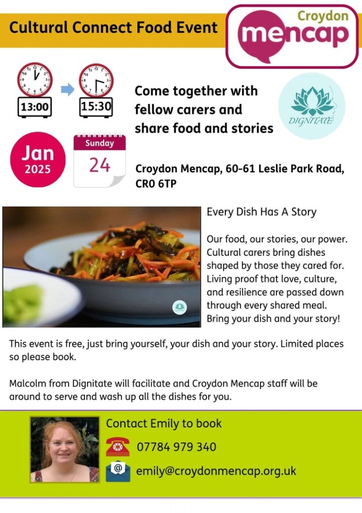 Communal meal 1pm Saturday, 24 January at Croydon Mencap, 60-61, Leslie Park Road #croydon Jan 21, 2026 · by eastcroydon · in Family & Education, Sport & Leisure. · More information https://www.facebook.com/MencapCroydon Share this: Share on X (Opens in new window) X Share on Facebook (Opens in new window) Facebook Share on Bluesky (Opens in new window) Bluesky Share on Nextdoor (Opens in new window) Nextdoor Like Loading... Related