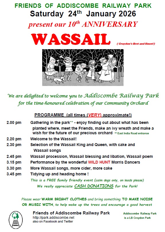 Wassail 2pm Saturday, 24 January in Addiscombe Railway Park, East India Way entrance #croydon Jan 21, 2026 · by eastcroydon · in Environment & Recycling, Sport & Leisure. · More information https://www.facebook.com/AddiscombePark/?locale=en_GB Share this: Share on X (Opens in new window) X Share on Facebook (Opens in new window) Facebook Share on Bluesky (Opens in new window) Bluesky Share on Nextdoor (Opens in new window) Nextdoor Like Loading... Related