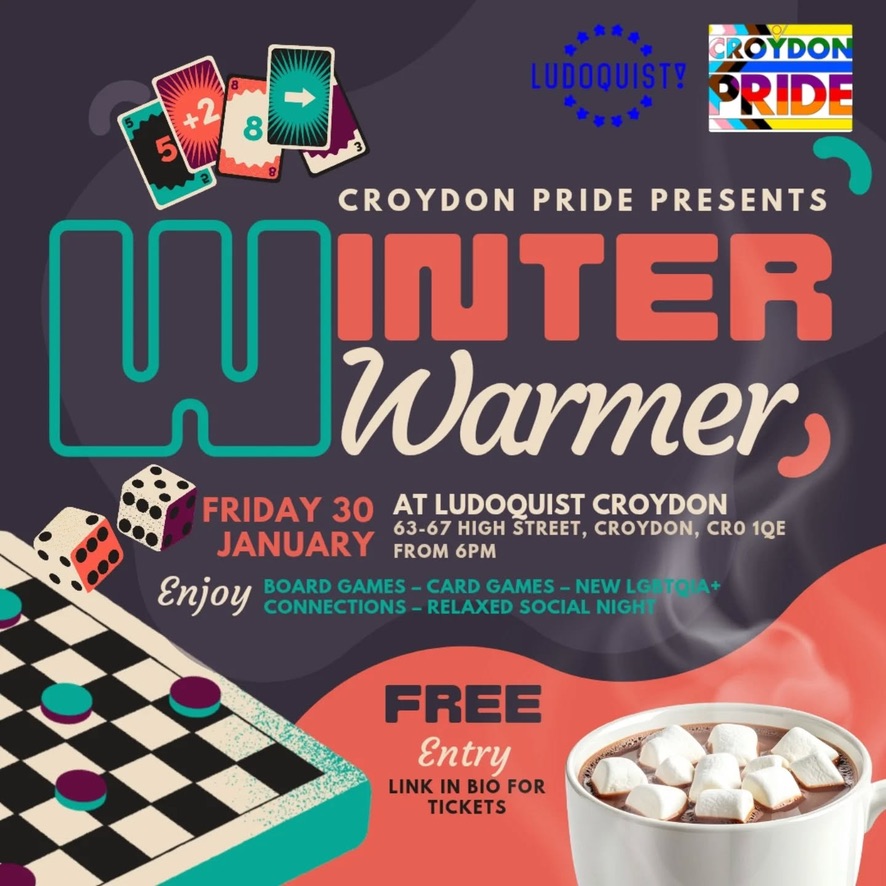 Croydon Pride social 6pm Friday, 30 January at Ludoquist, 63-67 Croydon High Street #croydon Jan 27, 2026 · by eastcroydon · in Sport & Leisure. · More information https://www.croydonpride.org.uk/category/event/ Share this: Share on X (Opens in new window) X Share on Facebook (Opens in new window) Facebook Share on Bluesky (Opens in new window) Bluesky Share on Nextdoor (Opens in new window) Nextdoor Like Loading... Related