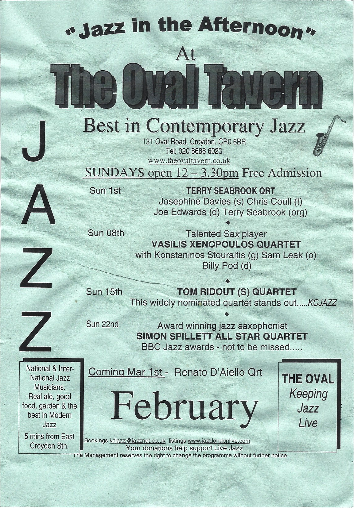 Jazz in February 2026 at The Oval Tavern, 131 Oval Road #croydon Jan 29, 2026 · by eastcroydon · in Sport & Leisure. · Share this: Share on X (Opens in new window) X Share on Facebook (Opens in new window) Facebook Share on Bluesky (Opens in new window) Bluesky Share on Nextdoor (Opens in new window) Nextdoor Like Loading... Related
