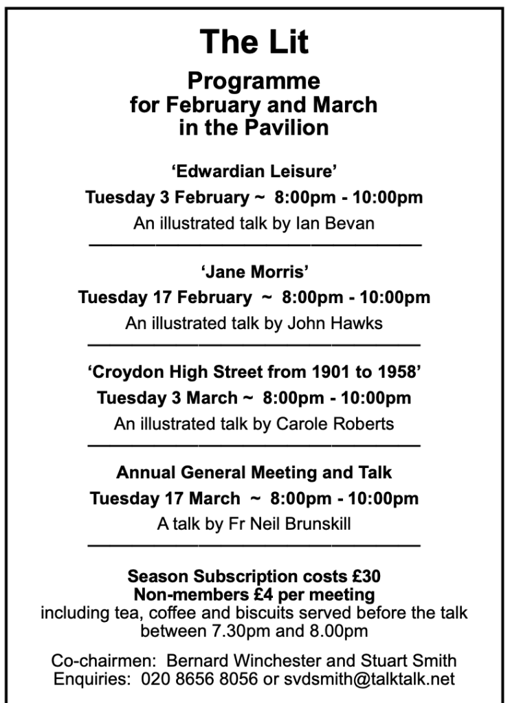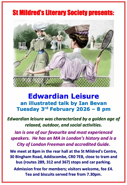 “Edwardian Leisure” talk 8pm Tuesday, 3 February at St Mildred’s Hall, Bingham Road #croydon Jan 31, 2026 · by eastcroydon · in History, Sport & Leisure. · Share this: Share on X (Opens in new window) X Share on Facebook (Opens in new window) Facebook Share on Bluesky (Opens in new window) Bluesky Share on Nextdoor (Opens in new window) Nextdoor Like Loading... Related