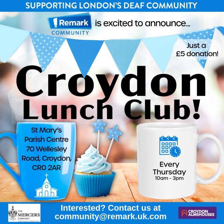 Croydon lunch club for the deaf community 10am-3pm Wednesdays at St Mary Parish Centre, 70 Wellesley Road #croydon Feb 3, 2026 · by eastcroydon · in Sport & Leisure. · More information https://www.remarkcommunity.org/our-clubs#remarkableclub Share this: Share on X (Opens in new window) X Share on Facebook (Opens in new window) Facebook Share on Bluesky (Opens in new window) Bluesky Share on Nextdoor (Opens in new window) Nextdoor Like Loading... Related
