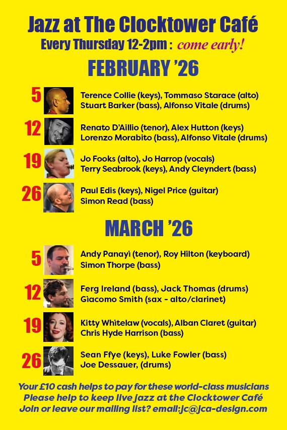 Jazz 12pm Thursdays in February & March 2026 at The Clocktower Cafe #croydon Feb 3, 2026 · by eastcroydon · in Sport & Leisure. · Share this: Share on X (Opens in new window) X Share on Facebook (Opens in new window) Facebook Share on Bluesky (Opens in new window) Bluesky Share on Nextdoor (Opens in new window) Nextdoor Like Loading... Related