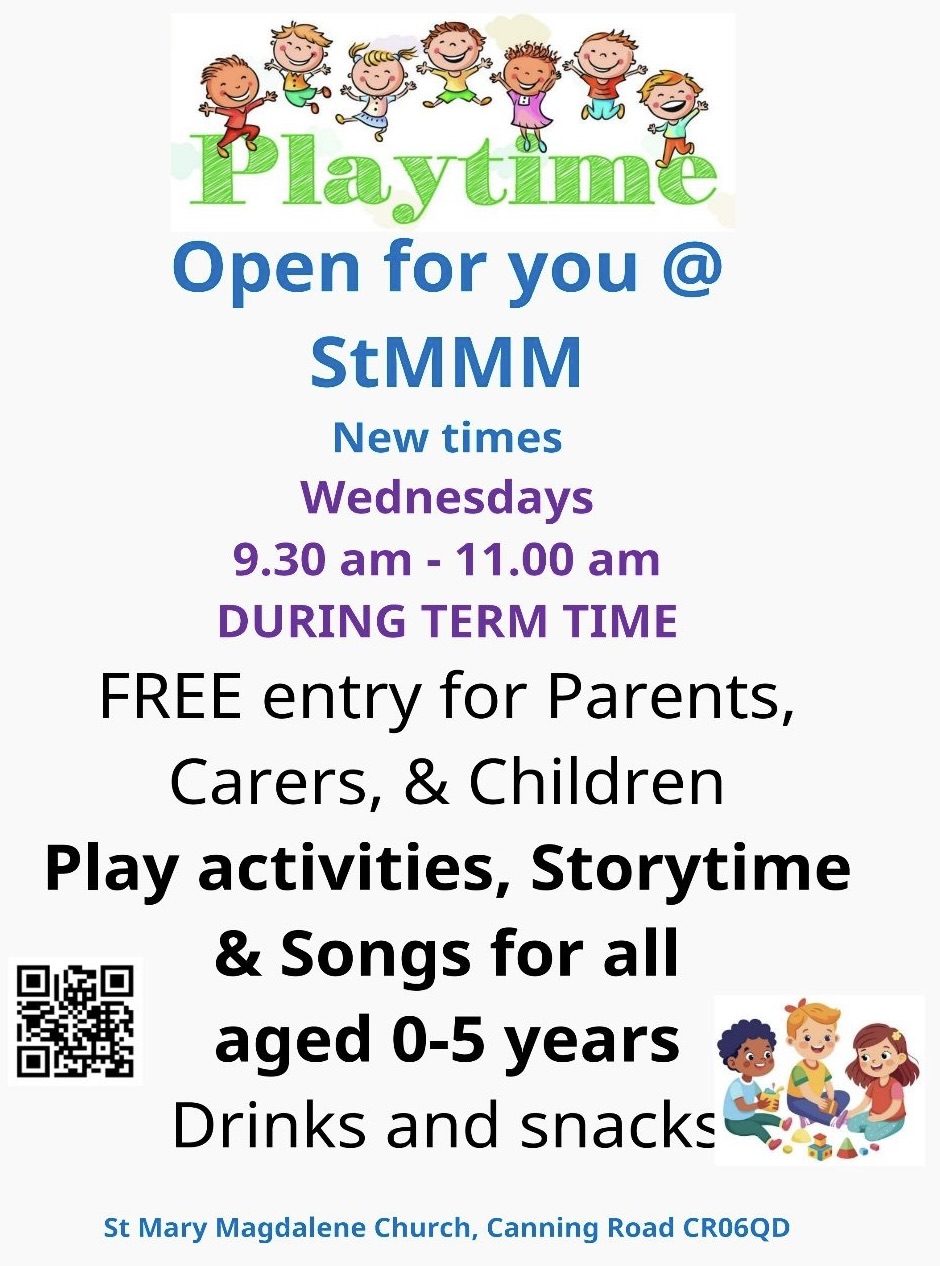 Playtime 9.30-11am Wednesdays at St Mary Magdalene, Canning Road #croydon Feb 9, 2026 · by eastcroydon · in Family & Education, Sport & Leisure. · More information https://www.stmmm.org.uk/ministries/playtime Share this: Share on X (Opens in new window) X Share on Facebook (Opens in new window) Facebook Share on Bluesky (Opens in new window) Bluesky Share on Nextdoor (Opens in new window) Nextdoor Like Loading... Related
