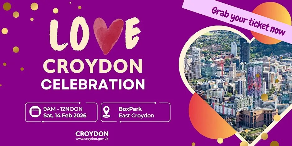 Love Croydon celebration 9am Saturday, 14 February at BoxPark, George Street #croydon Feb 11, 2026 · by eastcroydon · in Politics & Law. · More information https://www.eventbrite.com/e/love-croydon-a-celebration-tickets-1982011407474?aff=oddtdtcreator Share this: Share on X (Opens in new window) X Share on Facebook (Opens in new window) Facebook Share on Bluesky (Opens in new window) Bluesky Share on Nextdoor (Opens in new window) Nextdoor Like Loading... Related