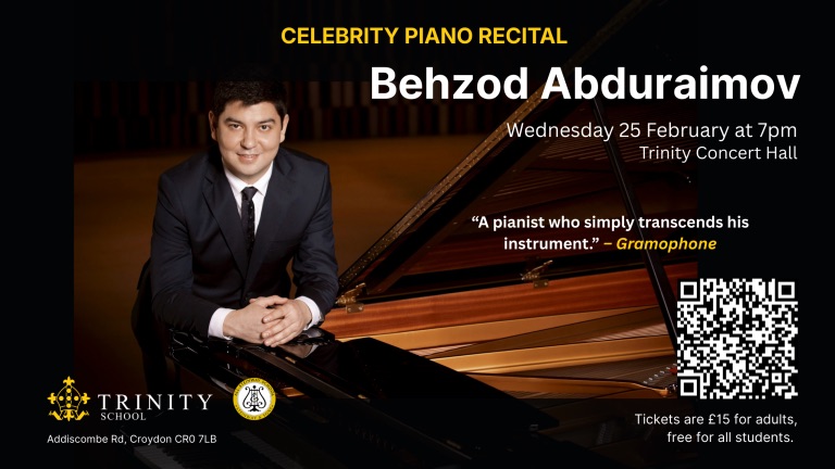 TONIGHT Behzod Abduraimov piano recital 7pm Wednesday, 25 February at Trinity School Concert Hall, Addiscombe Road #croydon Feb 25, 2026 · by eastcroydon · in Sport & Leisure. · More information https://www.trybooking.com/uk/events/landing/102014 Share this: Share on X (Opens in new window) X Share on Facebook (Opens in new window) Facebook Share on Bluesky (Opens in new window) Bluesky Share on Nextdoor (Opens in new window) Nextdoor Like Loading... Related