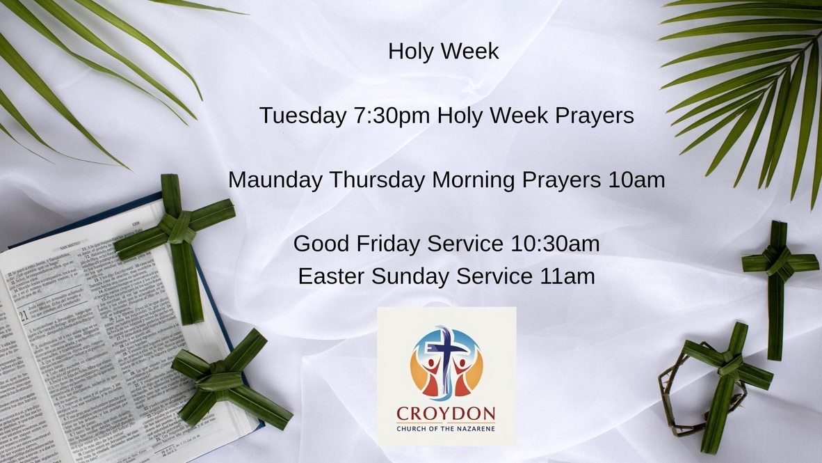 Holy week services from 7.30pm Tuesday, 31 March at the Church of the Nazarene, 55 Lower Addiscombe Road #croydon Mar 31, 2026 · by eastcroydon · in Faith & Charity. · More information https://www.facebook.com/profile.php?id=61561779329992 Share this: Share on X (Opens in new window) X Share on Facebook (Opens in new window) Facebook Share on Bluesky (Opens in new window) Bluesky Share on Nextdoor (Opens in new window) Nextdoor Like Loading... Related